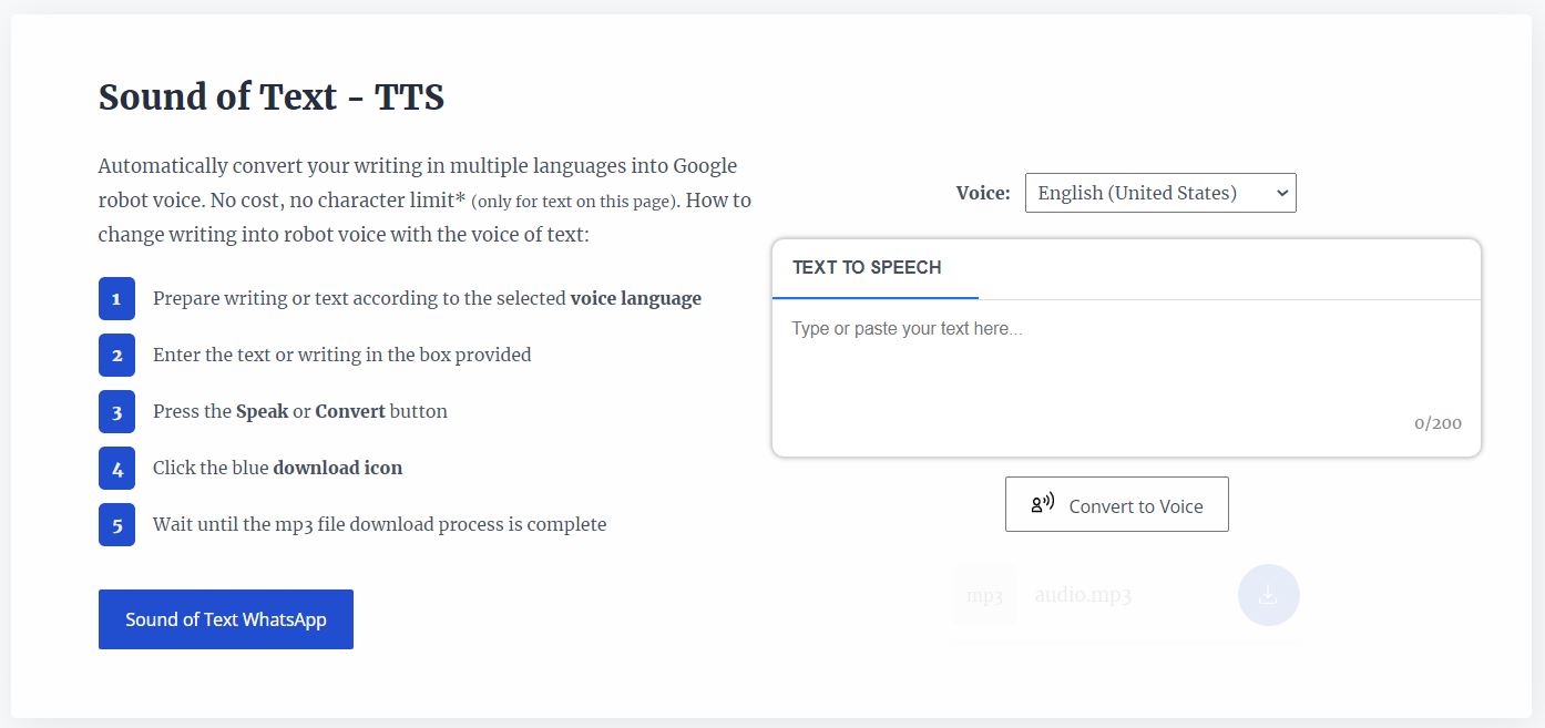 Sound of Text adalah platform serbaguna yang memungkinkan Anda untuk mengonversi teks menjadi suara melalui mesin teks ke ucapan Google. Platform ini mendukung bahasa Indonesia dan memungkinkan pengunduhan file audio dalam format MP3.